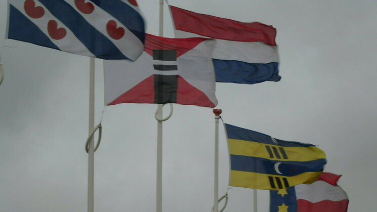 1. Friese vlag 2. Wagenborg Passagiersdiensten 3. Nederlandse vlag 4. Dorpsvlag Holwerd 5. Gemeente vlag Dongeradeel.
