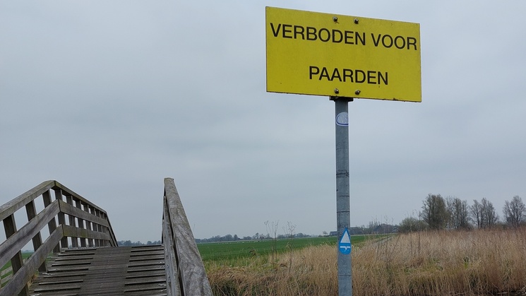 Ik had gezien dat ik 'ergens' voor Leeuwarden weer naar rechts moest, maar wist niet precies waar. Als ik aan het kijken ben waar het is, zie ik twee mensen met een hondje uit een weiland komen en over een hek klimmen. Ze hebben een gsm in de hand en doen ook mee met de AsUGo tocht, maar een andere afstand. Ik zie in de app dat dit niet het plek is waar ik naar rechts moet, dat is een stukje verder. Het koppel dat mij eerder had ingehaald, loopt 'gewoon' rechtdoor over het fietspad, maar ik wil wel graag de aangegeven route volgen, dus ga even extra goed kijken waar ik naar rechts moet.