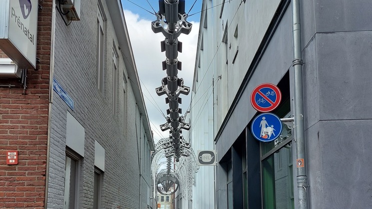 Ik vervolg mijn weg en wordt kriskras door Leeuwarden gestuurd, en ik zie voor het eerst de fonteinen bij het station. Met bekende en minder bekende stukken loop ik verder om richting de finish te gaan. Elke keer als ik denk dat ik weer die kant op ga, komt er weer een afslag naar links of rechts, zodat ik bijna twijfel of ik er ooit wel ga komen. Onderweg wordt het steeds spannender of ik nog wel voldoende stroom heb om de route te blijven volgen. Hij staat nu op 12%. De man van de de organisatie komt weer even langs en fietst een stukje naast me om de route nog even uit te leggen, en wijst me op een mooi kunstwerk in de Oude Lombardsteeg.