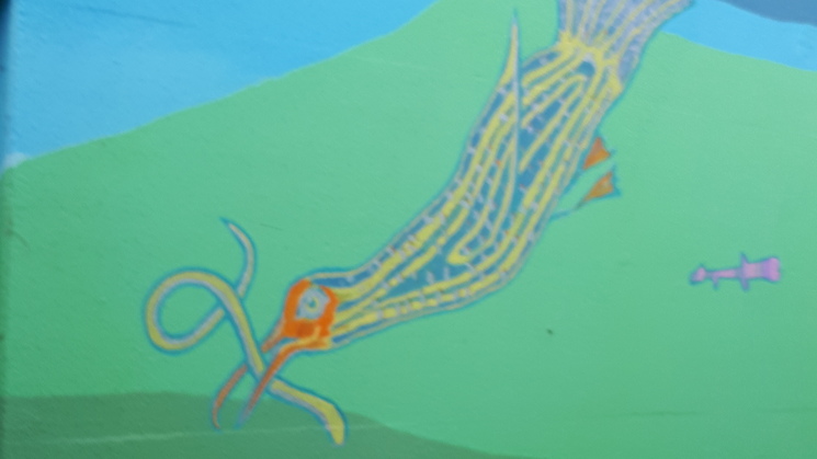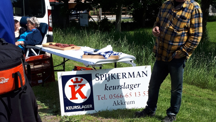 Als we Bitgum naderen zie ik een collega staan. Hij loopt een klein stukje met ons mee en rijdt daarna met zijn mooie DS weer verder. Wat een leuke verrassing ! We lopen verder door Bitgummole en krijgen daarna een heerlijk stukje droge worst (van Spijkerman) aangeboden. Op naar Stiens. We lopen richting de sportvelden en daar delen een paar kinderen nog een briefje uit voor een andere wandeltocht. Een jongen is met een bal aan het spelen en Geesiena schopt de bal wat 'bryk' terug, hup zo de sloot in. 'Jaaaaaah,' zei hij: "nou moet jij hem er ook uit halen'.... Dus, Geesiena op de knieën om de bal uit de sloot te vissen en geeft de bal terug. Hij loopt verder en schopt vervolgens zelf de bal in de sloot en zegt '"Nou mag je hem er wel weer uit halen ....! " Nou, dat dacht ik niet, dat mag je zelf doen, je hebt hem er ook zelf in geschopt. We konden er wel om lachen. In de kantine hebben we een lekker soepje gegeten en nog een broodje.